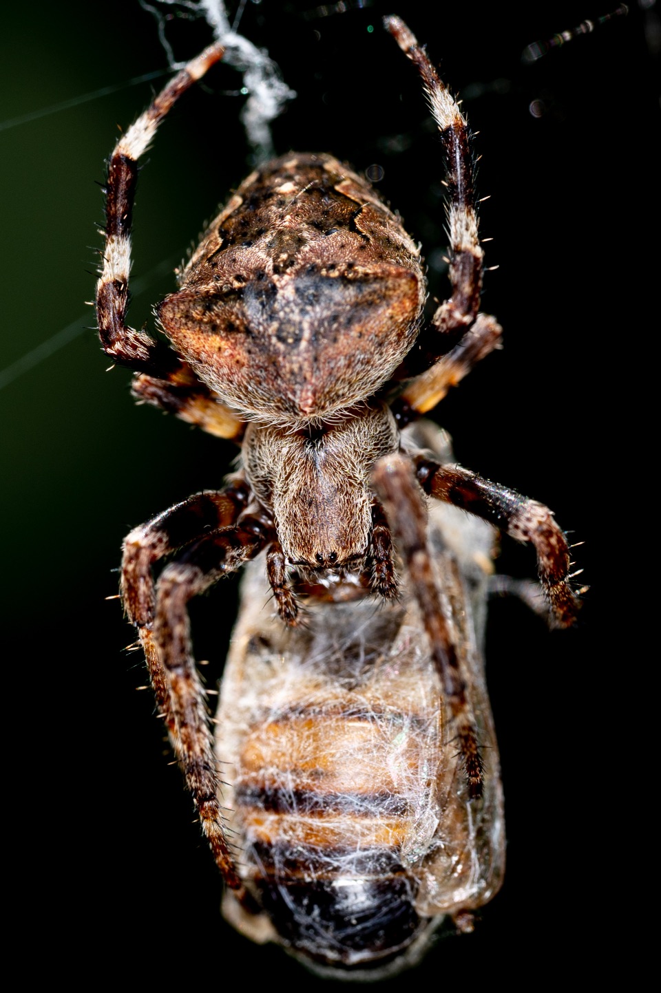 Webspinnen haben an ihren Beinen winzige Härchen, die das Festkleben verhindern. Manche Arten scheiden zusätzlich eine fettige oder ölige Substanz aus, die hilft, nicht haften zu bleiben. Außerdem bestehen Spinnennetze nicht nur aus klebrigen Fäden: Tragfäden und Rahmenfäden sind in der Regel nicht klebrig. Spinnen bewegen sich meist gezielt nur auf diesen nicht-klebrigen Bereichen des Netzes.